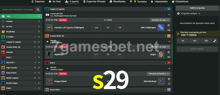 O s29 oferece uma grande seleção de opções de apostas em e-sports com probabilidades competitivas